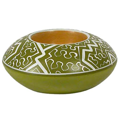 Measuring 2 inches high and 4 3/4 inches in diameter, this tea light holder is available in three beautiful colors: Cherry, Green, and White. Each holder is lightweight and crafted without the use of pottery wheels, showcasing the unique techniques employed by Shipibo artisans. The communal nature of their work means that multiple artisans may contribute to a single piece, resulting in a cohesive design that appears as if created by one artist.