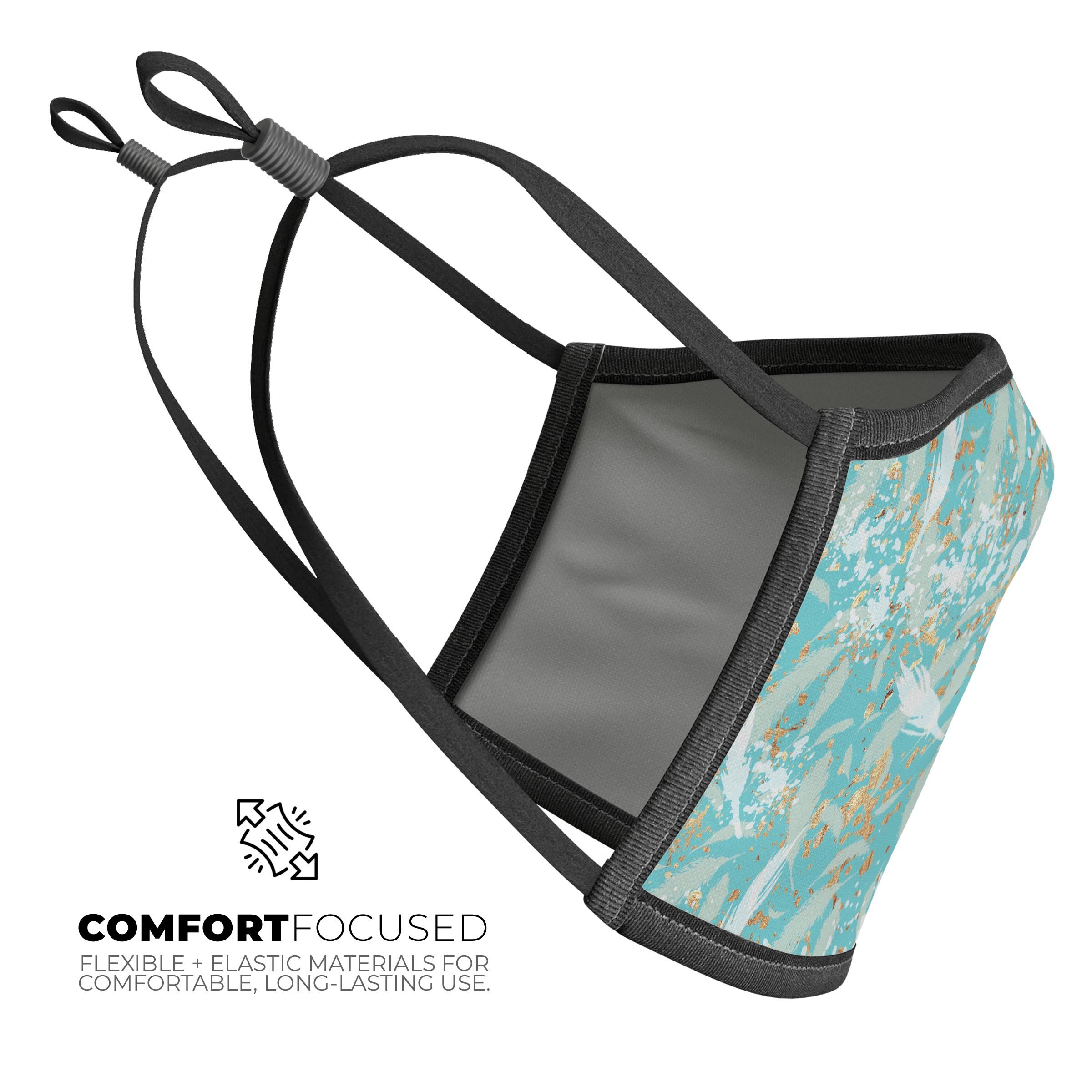 Our Teal and Orange Whispy Waterstrokes mouth cover is designed for longevity. It is 100% machine or hand washable, allowing you to keep it clean and fresh for repeated use. The dye-sublimation printing technique ensures that the vibrant colors remain intact, even after multiple washes. This means you can wear your mask confidently, knowing it will look great every time you put it on.