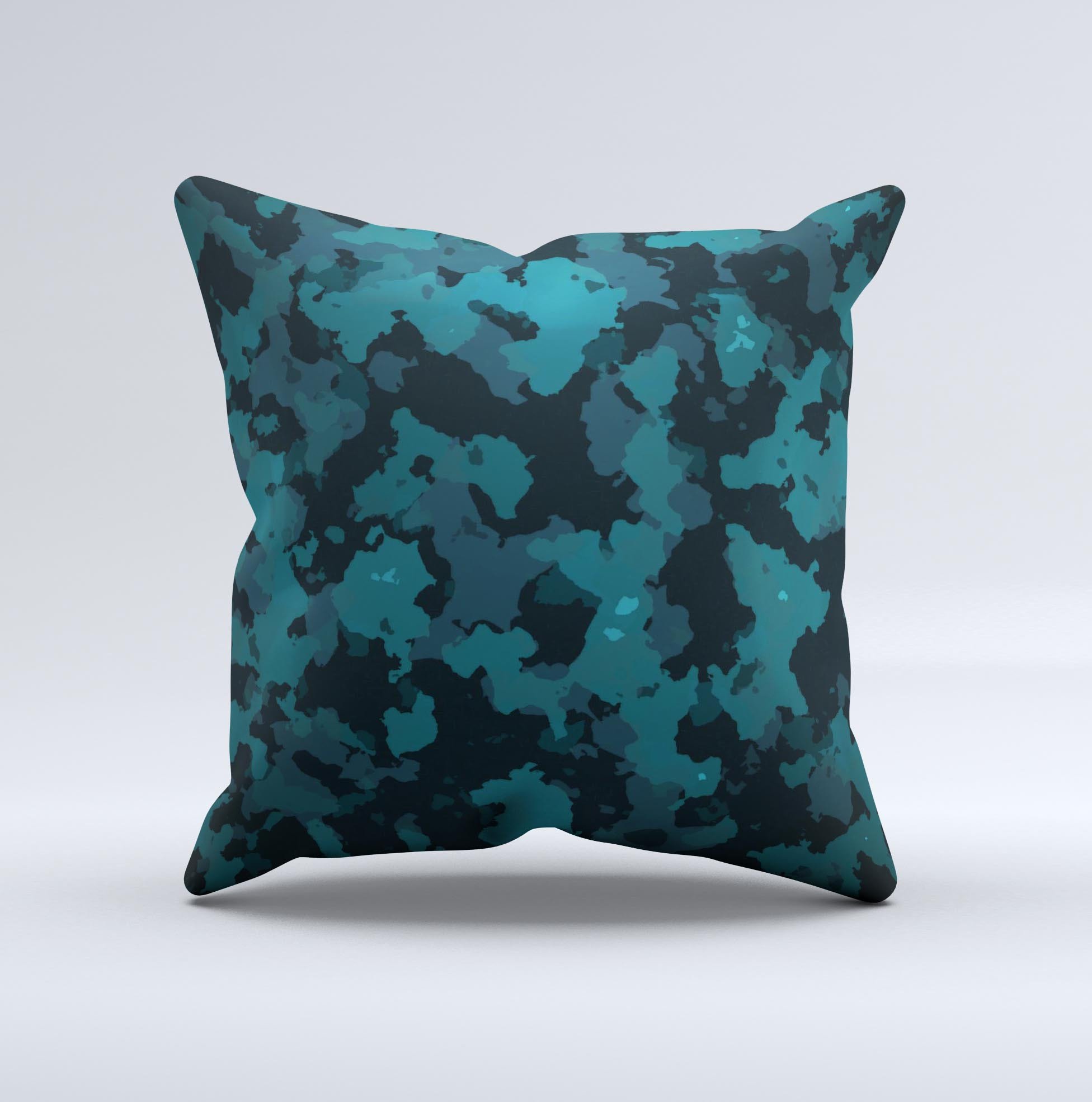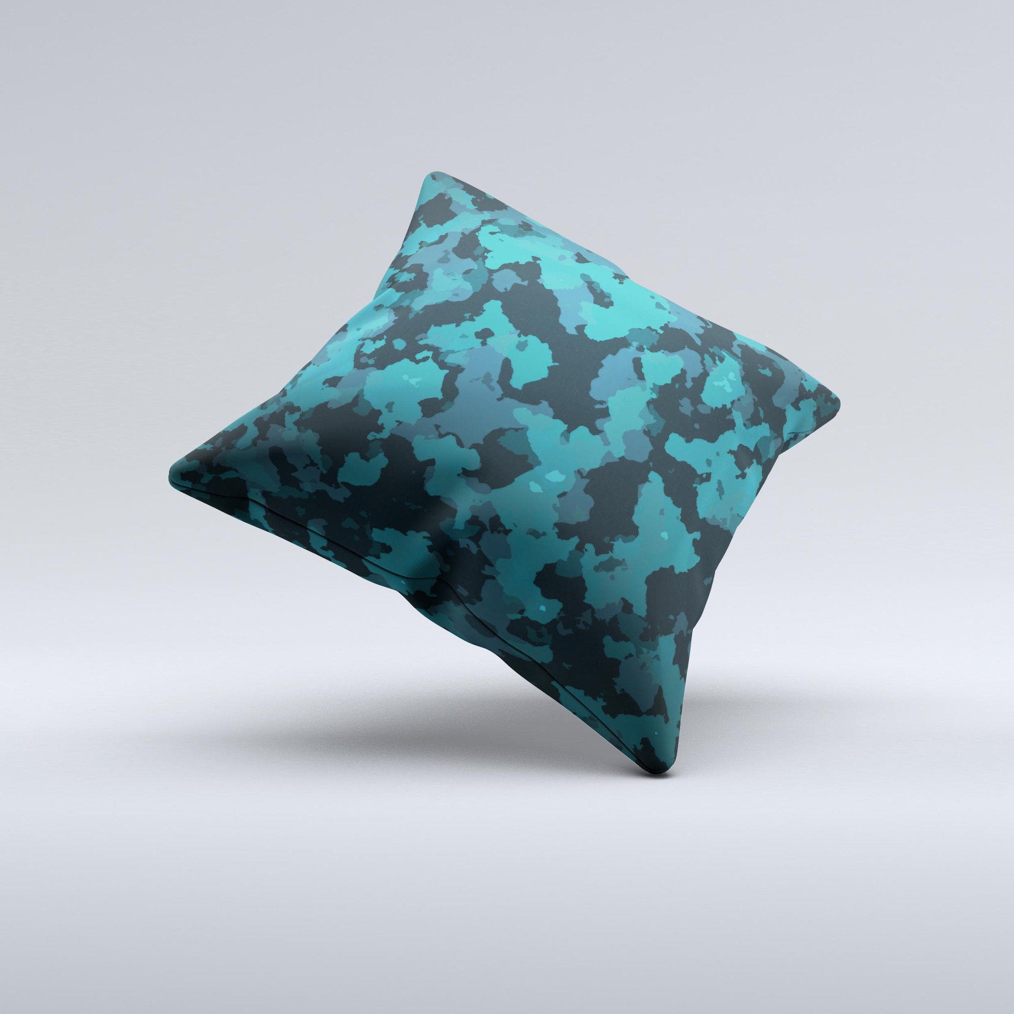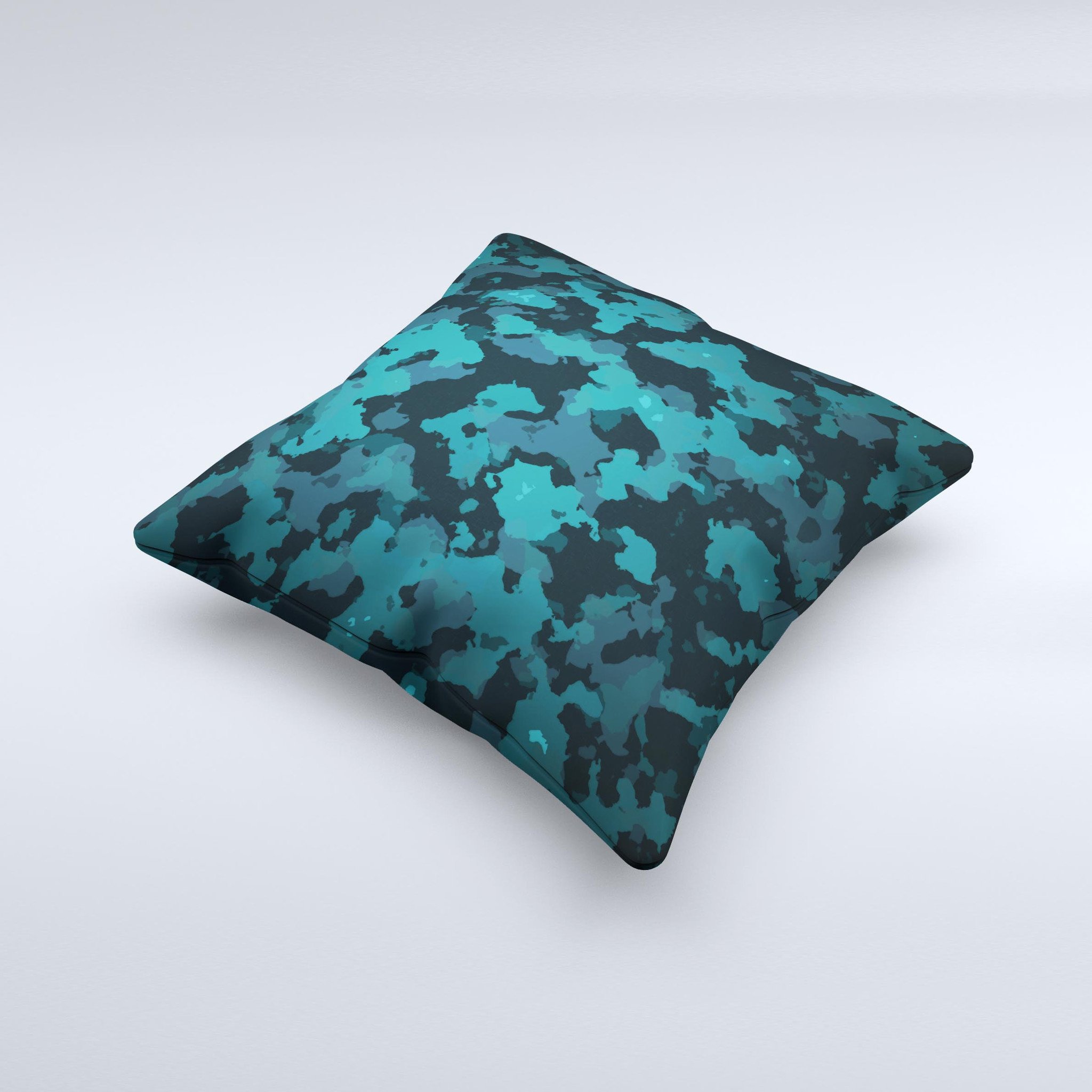 Teal Vector Camo Ink-Fuzed Decorative Throw Pillow showcasing a unique camo design with a soft fabric texture.