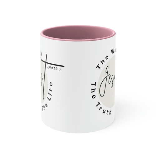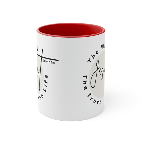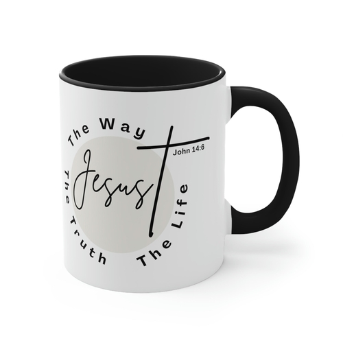 Introducing the Two-tone Accent Ceramic Mug 11oz, featuring the inspiring phrase 'Jesus the Way the Truth the Life'. This beautifully designed mug is perfect for those who want to add a touch of color and inspiration to their daily routine. Whether you're sipping your morning coffee, enjoying an afternoon tea, or indulging in hot chocolate, this mug is designed to enhance your drinking experience.