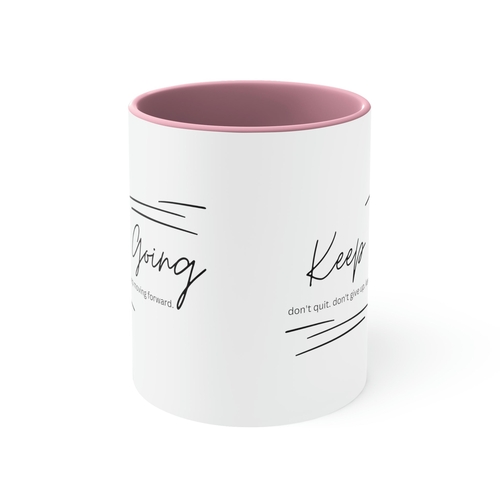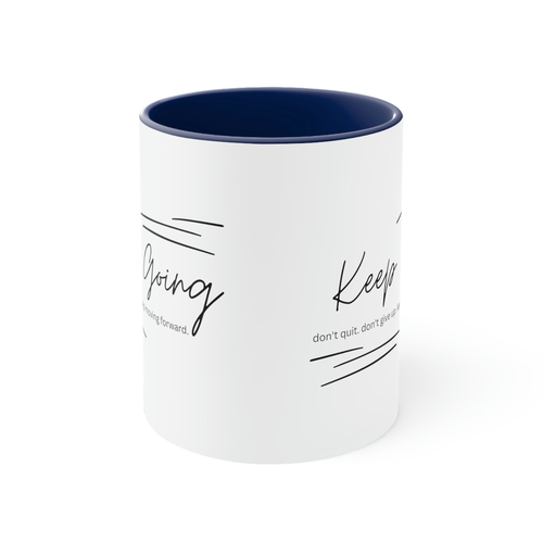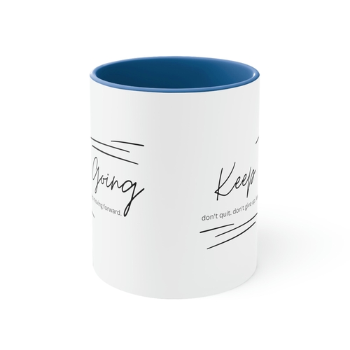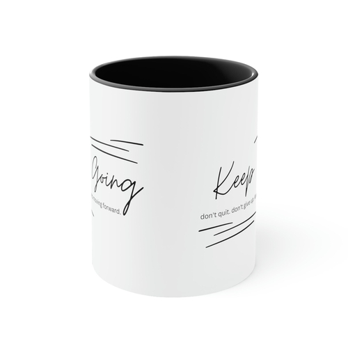 Introducing the Two-tone Accent Ceramic Mug, a stylish and functional addition to your drinkware collection. This 11oz mug is designed to brighten your day with its vibrant colors and motivational message, 'Keep Going Don’t Give Up.' Whether you're enjoying your morning coffee, afternoon tea, or any beverage of your choice, this mug is sure to inspire you to stay positive and motivated.