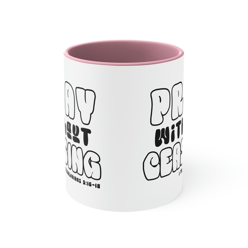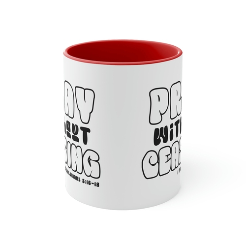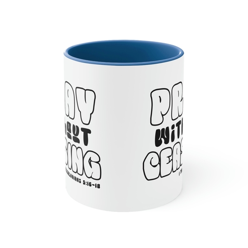 In summary, the Two-tone Accent Ceramic Mug 11oz is a stylish and functional addition to your drinkware collection. With its comfortable design, high-quality material, and inspirational message, it’s perfect for personal use or as a gift. Enjoy your beverages in style and let the message of 'Pray Without Ceasing' inspire you throughout your day.