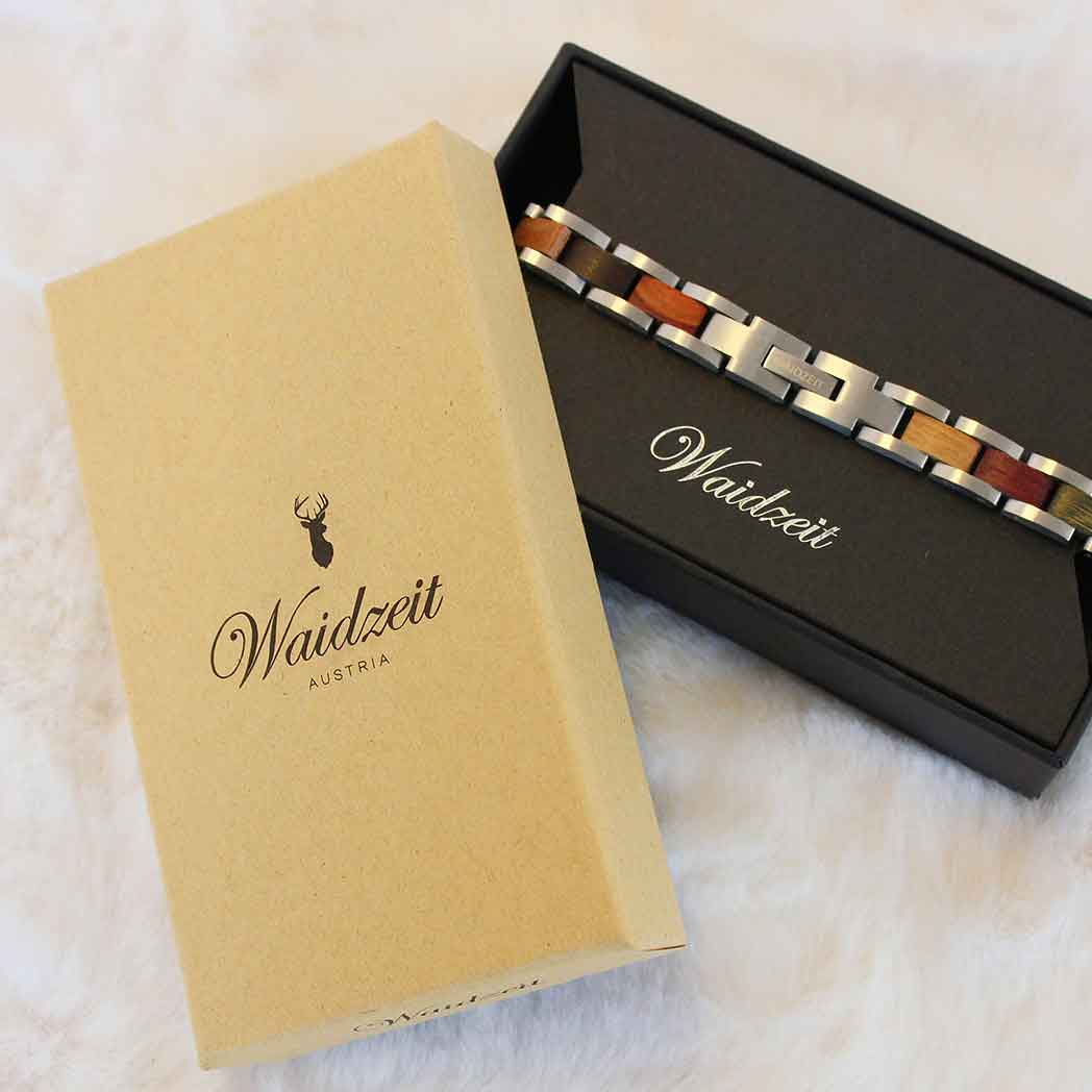 Waidzeit Element Bracelet for women featuring wood and stainless steel with gold accents, elegantly displayed in a gift box.