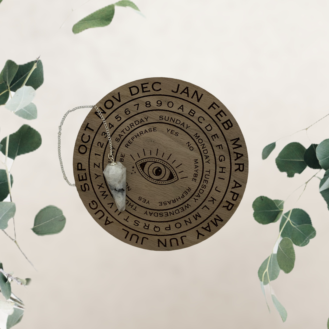 Discover the power of intuition with our Wooden Pendulum Board with Moonstone Pendulum. This beautifully crafted 5-inch wooden board is designed to enhance your divination practices and help you connect with your inner guidance. Whether you are a beginner or an experienced practitioner, this pendulum board is an essential tool for anyone looking to deepen their spiritual journey.