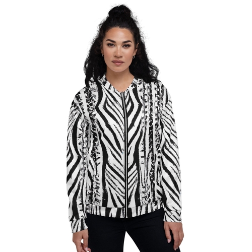 Introducing our Women's Bomber Jacket in a striking black and white native print, designed for the modern woman who values both style and comfort. This jacket is not just a piece of clothing; it's a statement that enhances your wardrobe and showcases your unique fashion sense. With its zip-front closure and ribbed cuffs, this bomber jacket provides a snug fit that flatters your silhouette while ensuring you stay warm and cozy.