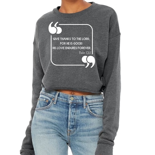 Introducing our Women's Cropped Graphic Sweatshirt, a perfect blend of comfort and style. This sweatshirt is designed to keep you warm during the colder months while making a fashionable statement. The uplifting message 'Give Thanks to the Lord' adds a touch of positivity to your wardrobe, making it an ideal choice for casual outings, lounging at home, or even running errands.