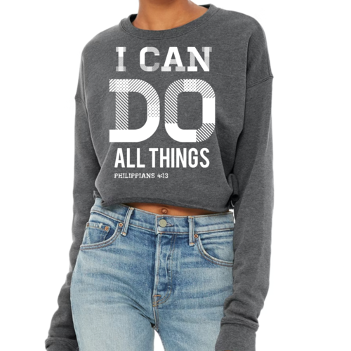 Introducing the Women's Cropped Graphic Sweatshirt featuring the empowering scripture from Philippians 4:13, 'I Can Do All Things.' This stylish and comfortable sweatshirt is designed for women who want to express their faith while looking chic. Made from a high-quality blend of 50% polyester and 50% cotton, this cropped sweatshirt is not only soft to the touch but also breathable, making it an ideal choice for any season.
