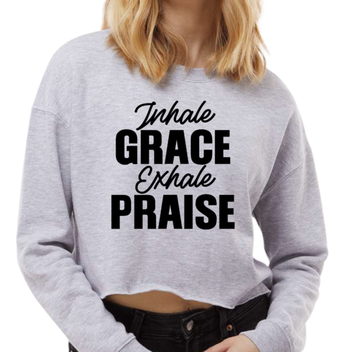 The cropped design of this sweatshirt adds a modern twist to your wardrobe. It pairs perfectly with high-waisted jeans, skirts, or shorts, allowing you to create a variety of stylish outfits. The graphic print, 'Inhale Grace Exhale Praise,' adds a motivational touch, making it not just a piece of clothing but a statement of positivity and grace.