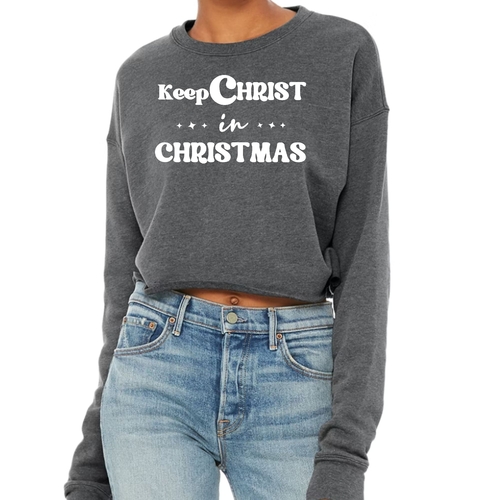 Introducing our Women's Cropped Graphic Sweatshirt, a must-have for the holiday season! This stylish sweatshirt features the uplifting message 'Keep Christ in Christmas', making it a perfect choice for those who want to celebrate their faith while staying fashionable. Made from a soft and comfortable blend of 80% ring-spun cotton and 20% polyester (with heather grey being 75% cotton and 25% polyester), this sweatshirt is designed to keep you warm during the colder months.