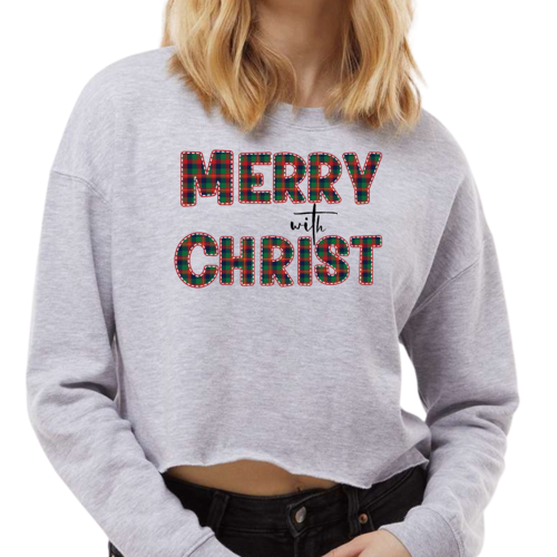 Embrace the holiday spirit with our Women's Cropped Graphic Sweatshirt, featuring a cheerful 'Merry with Christ' design. This stylish sweatshirt is not only a fashion statement but also a cozy addition to your winter wardrobe. Made from a blend of 80% ring-spun cotton and 20% polyester, this sweatshirt offers a soft touch against your skin, ensuring comfort throughout the day.
