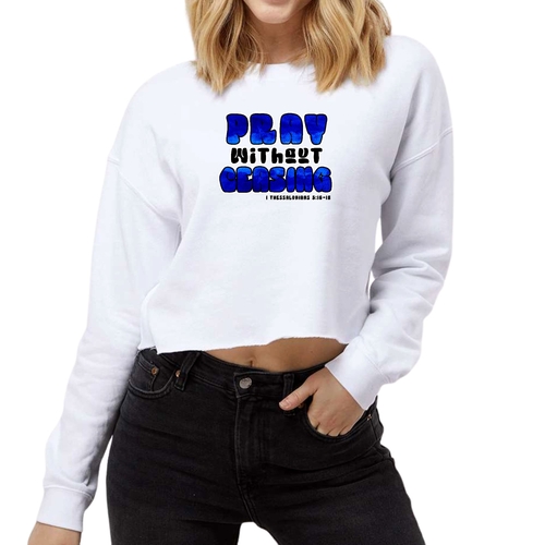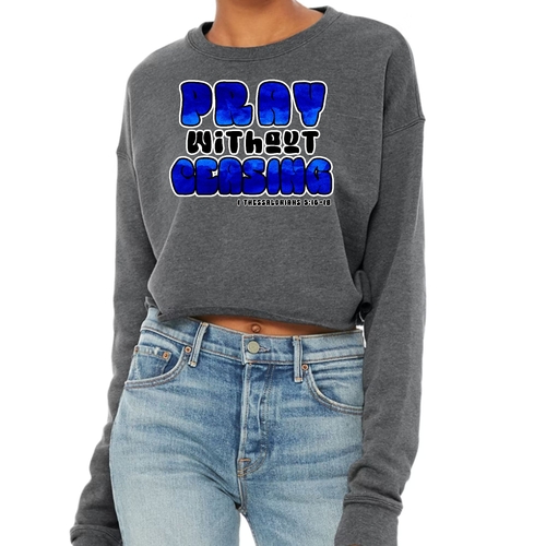 Introducing our Women's Cropped Graphic Sweatshirt, a perfect blend of style and comfort. This sweatshirt features a unique 'Pray Without Ceasing' graphic that not only makes a statement but also adds a touch of inspiration to your everyday wardrobe. Crafted from a high-quality 50/50 cotton and polyester blend, this cropped sweatshirt is designed to keep you comfortable while looking effortlessly chic.