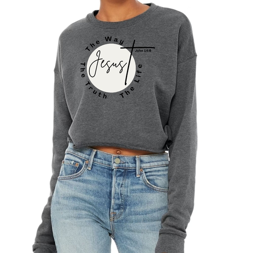 Introducing the Women's Cropped Graphic Sweatshirt, a stylish and comfortable addition to your wardrobe that features the powerful affirmation 'The Truth The Way The Life.' This sweatshirt is not just a fashion statement; it embodies a message of faith and positivity, making it a perfect choice for those who want to express their beliefs through their clothing.