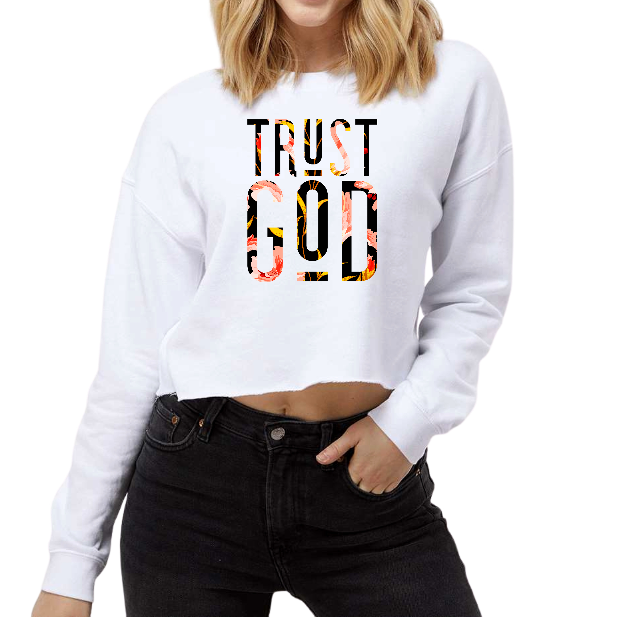 Dropship Womens Cropped Graphic Sweatshirt - Trust God Floral Print