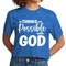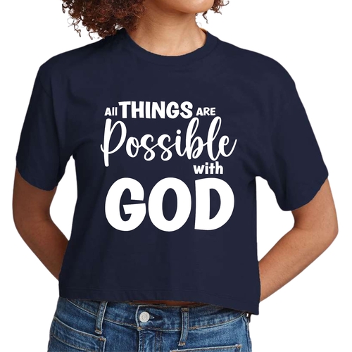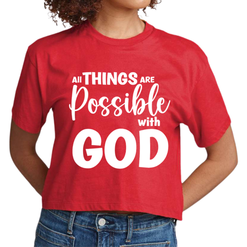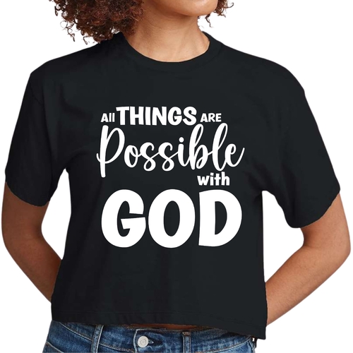 In summary, the Women's Cropped Graphic T-shirt with the message 'All Things are Possible with God' is more than just a piece of clothing; it's a statement of faith and a testament to comfort and style. Perfect for any occasion, this t-shirt is a must-have for anyone looking to express their beliefs while enjoying a fashionable look.