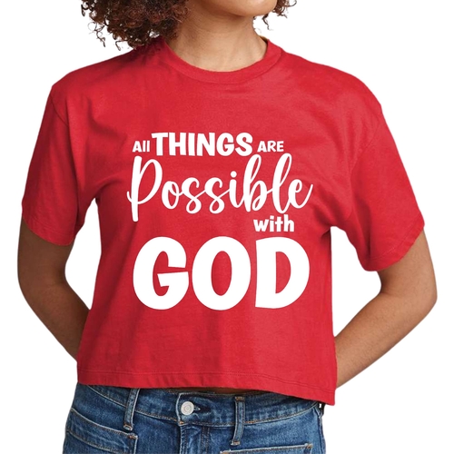 Introducing our Women's Cropped Graphic T-shirt, a perfect blend of comfort and inspiration. This stylish tee features the uplifting message 'All Things are Possible with God', making it a great addition to your casual wardrobe. Crafted from soft, preshrunk cotton, this t-shirt ensures that you not only look good but feel great too.