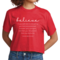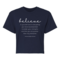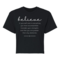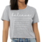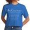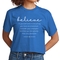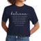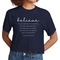 Introducing our Women's Cropped Graphic T-shirt, featuring the empowering message 'Believe in Yourself'. This stylish and comfortable tee is perfect for those who want to express their motivation and positivity through fashion. Made from high-quality preshrunk cotton, this t-shirt retains its softness and size even after multiple washes, ensuring that you look and feel great every time you wear it.