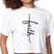 The standout feature of this t-shirt is its eye-catching Faith Script Cross illustration. This design not only adds a touch of elegance but also serves as a reminder of your faith. The cropped style is perfect for pairing with high-waisted jeans, skirts, or shorts, allowing you to create a variety of fashionable looks.