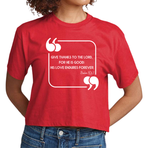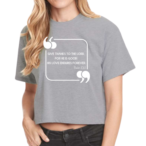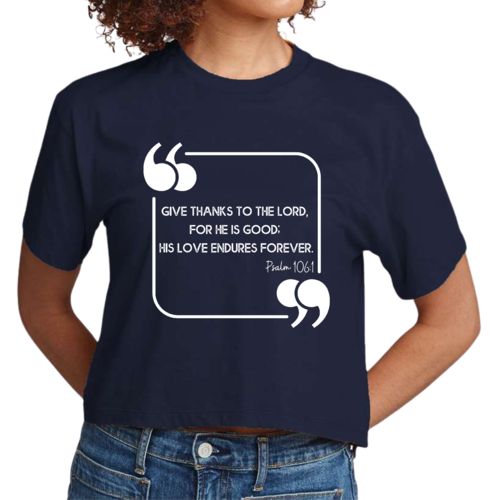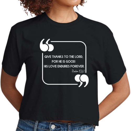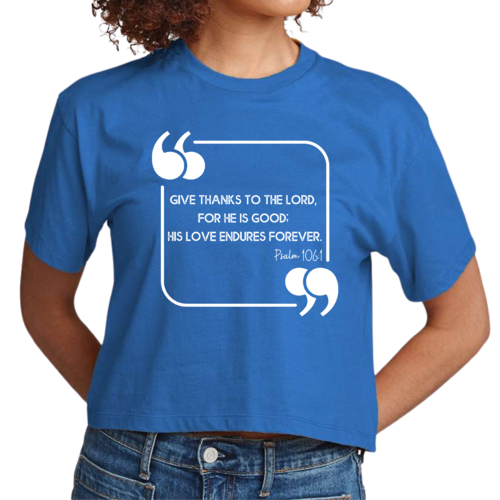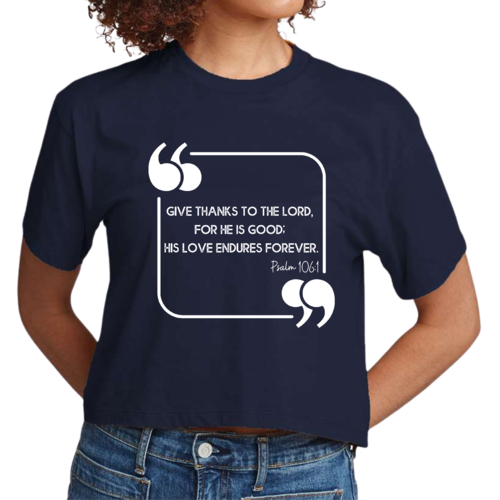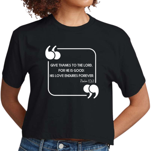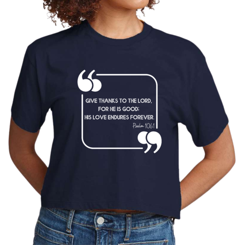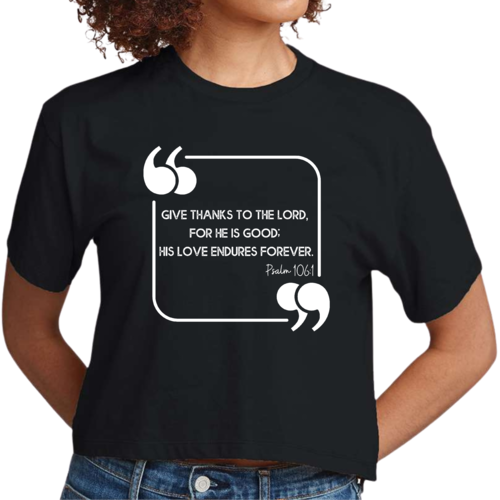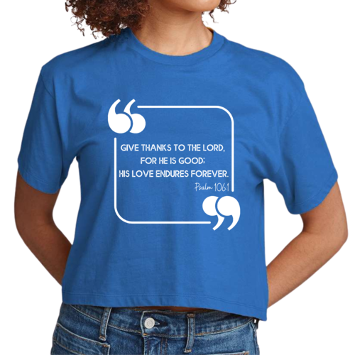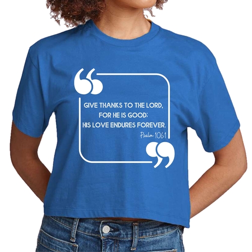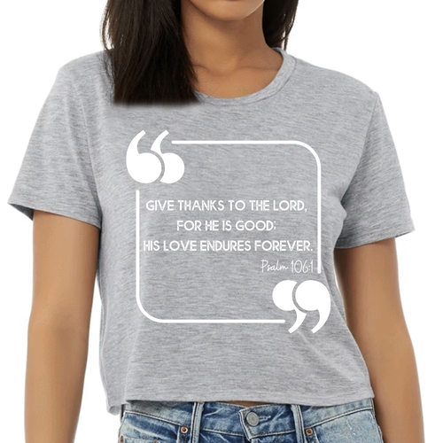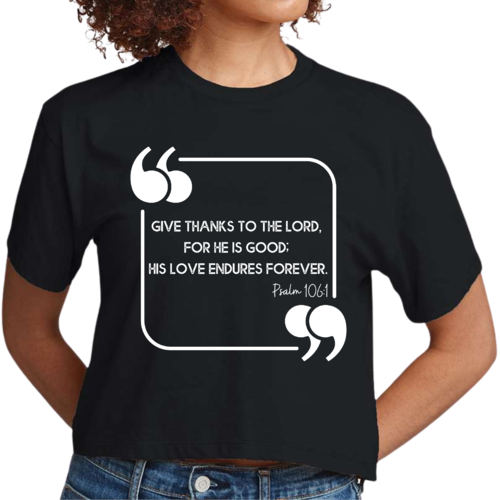 This Women's Cropped Graphic T-shirt is incredibly versatile. Pair it with high-waisted jeans for a casual day out, or wear it with your favorite leggings for a comfortable yet stylish look at home. The graphic design, which features the uplifting message 'Give Thanks to the Lord,' adds a touch of positivity to your outfit, making it a great choice for everyday wear.