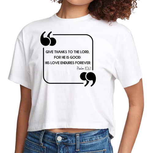 Introducing the Women's Cropped Graphic T-shirt, a must-have addition to your wardrobe that combines style and comfort. This trendy t-shirt features a bold 'Give Thanks to the Lord' graphic, making it a perfect choice for expressing your faith while staying fashionable. Crafted from high-quality materials, this shirt is designed to be your go-to for casual outings, lounging at home, or even running errands.