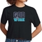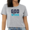 Women's cropped graphic T-shirt in navy blue and blue-green with 'God @ Work' print, showcasing a stylish and comfortable design.