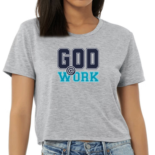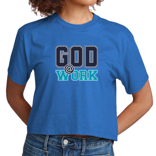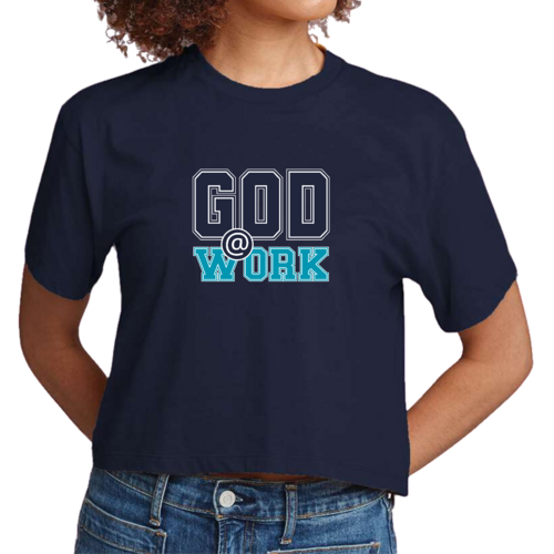 In summary, the Women's Cropped Graphic T-shirt featuring 'God @ Work' in navy blue and blue-green is a must-have for anyone looking to combine comfort with style. Its high-quality materials, thoughtful design, and meaningful graphic make it a standout piece in any wardrobe.