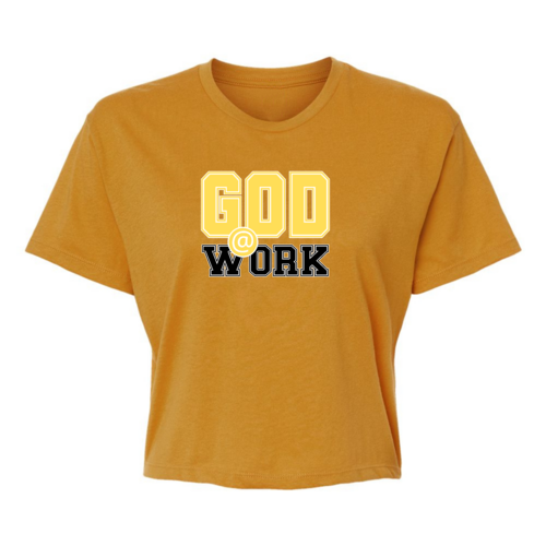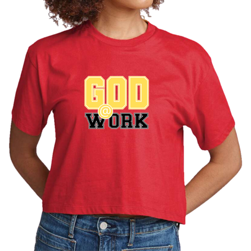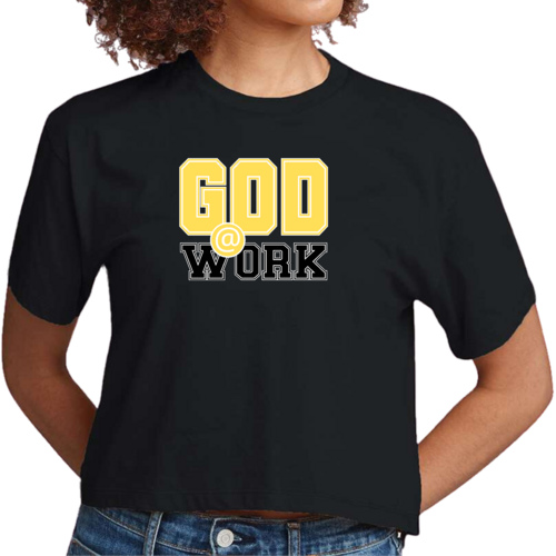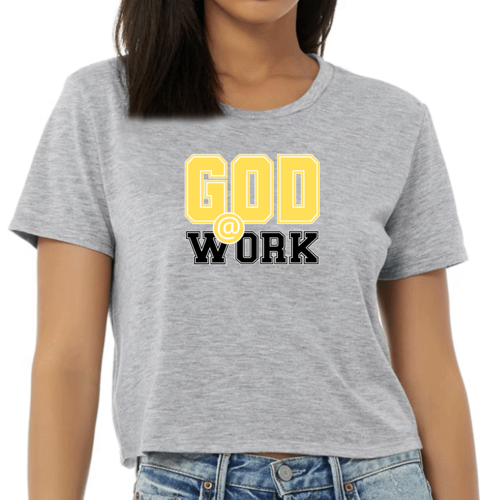 Whether you're looking to refresh your wardrobe or searching for the perfect gift, our Women's Cropped Graphic T-shirt with the God @ Work print is an excellent choice. Embrace your faith and showcase your style with this trendy and comfortable t-shirt.