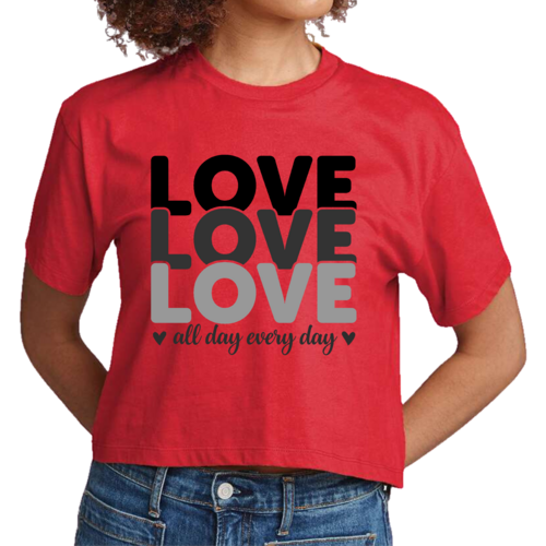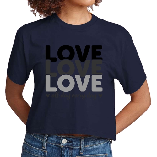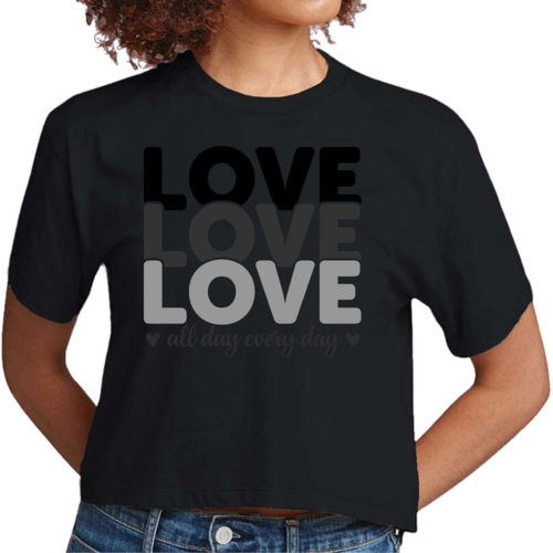 Introducing our Womens Cropped Graphic T-shirt, a must-have addition to your wardrobe that combines style, comfort, and self-expression. Featuring the eye-catching 'Love All Day Every Day' black print, this t-shirt is designed for those who appreciate unique and artistic fashion. Crafted from high-quality preshrunk cotton, it ensures a comfortable fit that lasts, making it perfect for everyday wear.