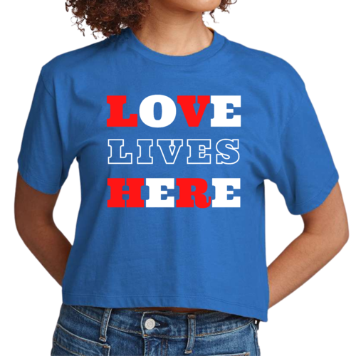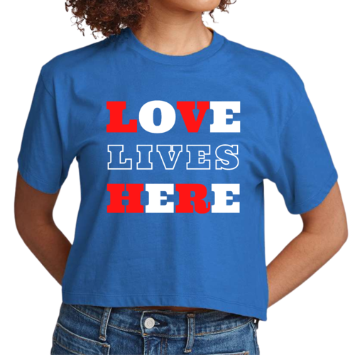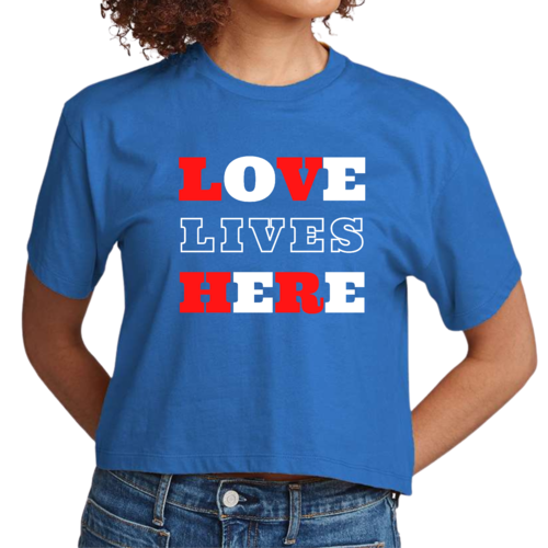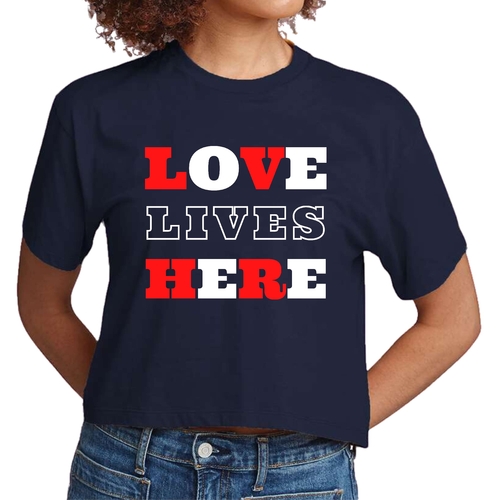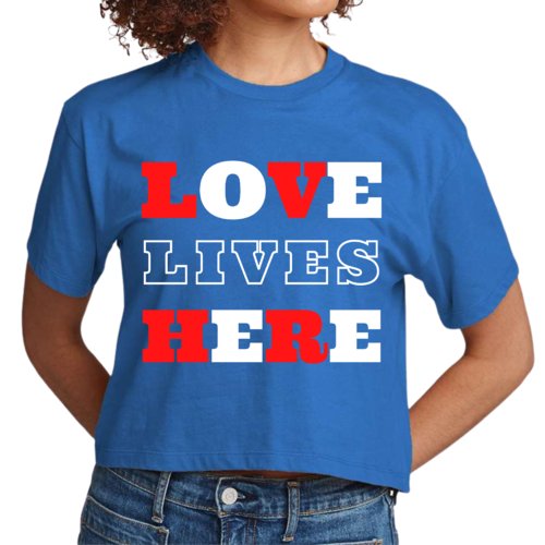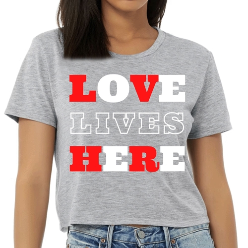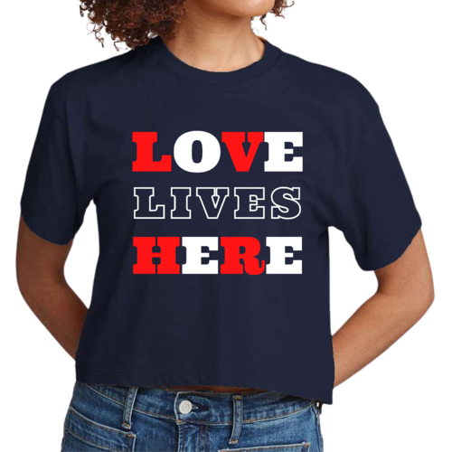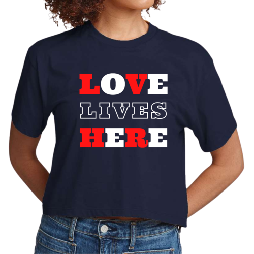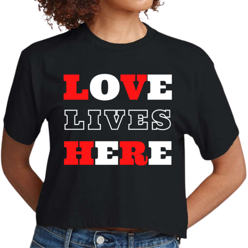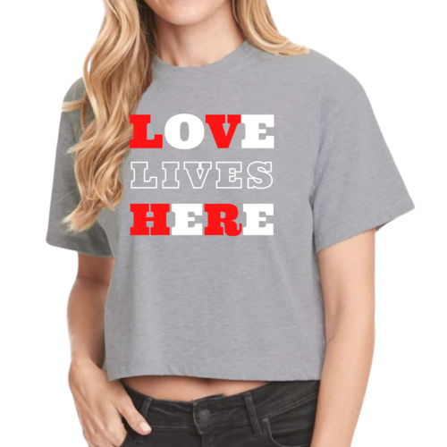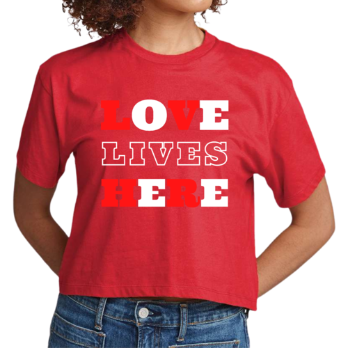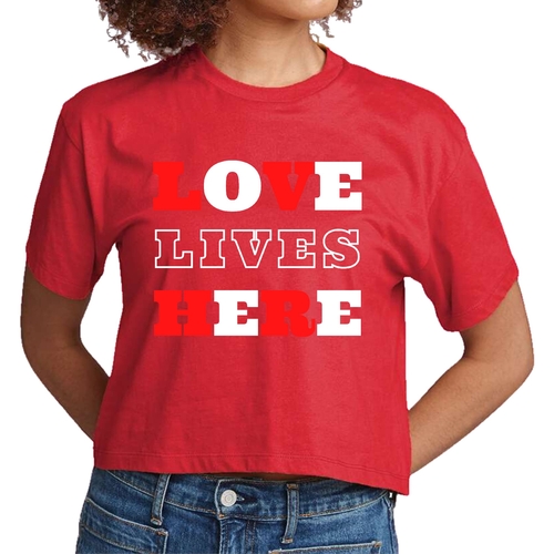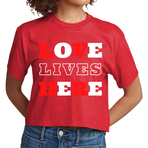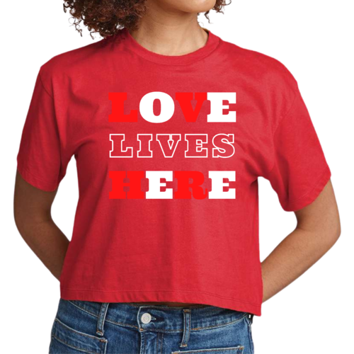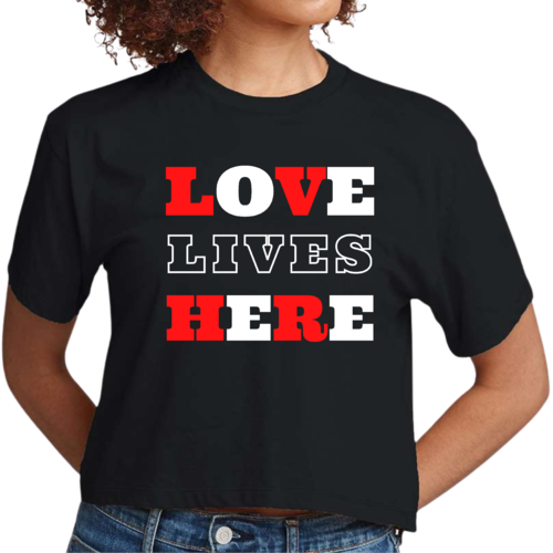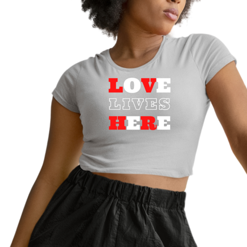 Introducing our Women's Cropped Graphic T-shirt, a perfect blend of style and inspiration. This trendy tee features the uplifting message 'Love Lives Here', making it an ideal choice for those who want to express their faith through fashion. Crafted from 100% combed and ring-spun cotton, this shirt offers a soft and comfortable fit that feels like a well-loved favorite.