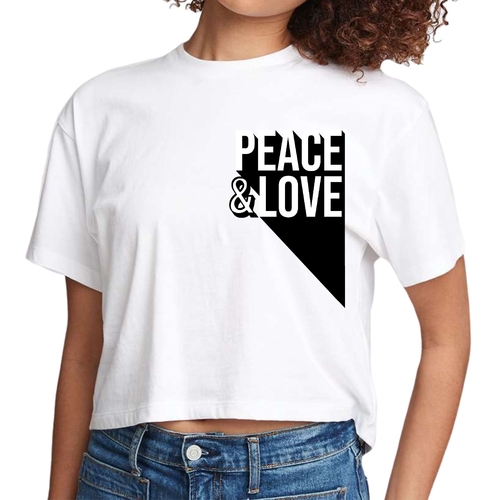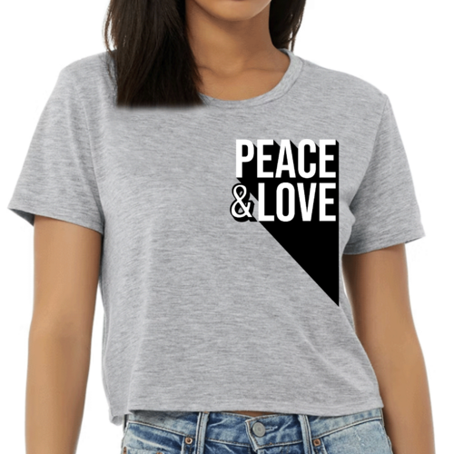 This cropped graphic tee is incredibly versatile and can be styled in numerous ways. Pair it with high-waisted jeans for a casual day out, or wear it with a flowy skirt for a more dressed-up look. Layer it under a denim jacket or a cardigan for cooler days. The Peace and Love print adds a touch of positivity to any outfit, making it a great choice for expressing your personal style.