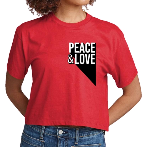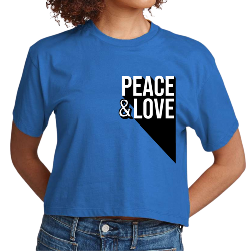 Introducing our Women's Cropped Graphic T-shirt, a perfect blend of style and comfort. This tee features a vibrant Peace and Love print that serves as an inspiration affirmation, making it a must-have addition to your wardrobe. Crafted from soft, preshrunk cotton, this shirt ensures that you not only look good but feel great too.