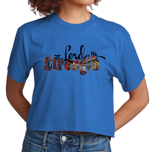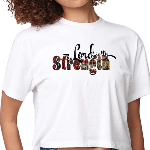 Introducing our Womens Cropped Graphic T-shirt, featuring the uplifting print 'The Lord is my Strength'. This stylish and comfortable tee is perfect for those who want to express their faith while enjoying a relaxed fit. Made from high-quality preshrunk cotton, this t-shirt retains its softness and shape even after multiple washes, ensuring you can wear it with confidence time and time again.