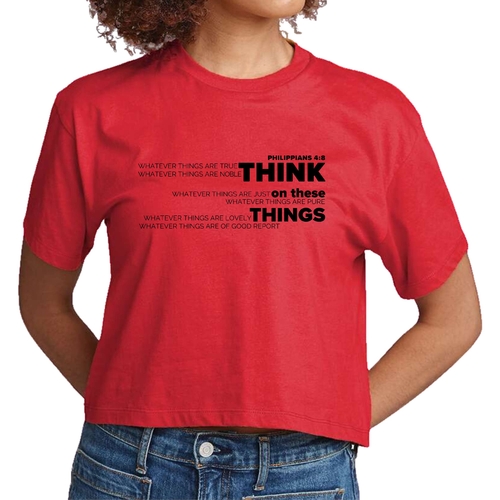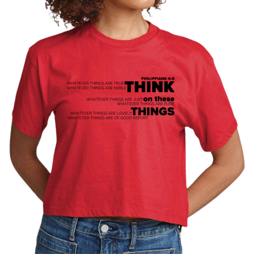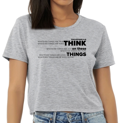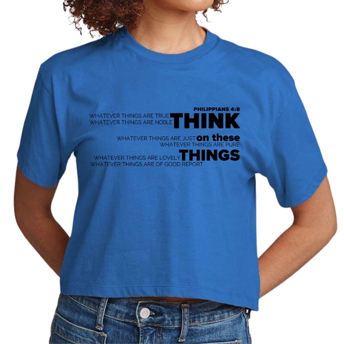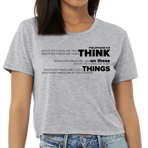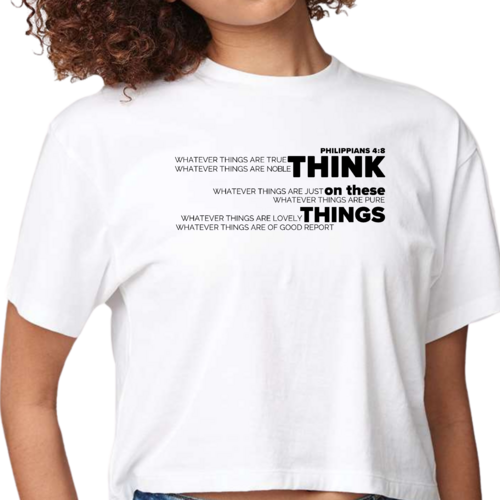 In summary, the Women's Cropped Graphic T-shirt featuring the 'Think On These Things' quote is a must-have addition to your wardrobe. With its comfortable fit, stylish design, and meaningful message, this t-shirt is perfect for anyone looking to combine fashion with faith. Don’t miss out on this opportunity to express your beliefs while staying trendy!