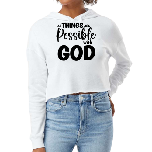 In summary, the Women's Cropped Hoodie: 'All Things are Possible with God' in black is a must-have for any fashion-forward woman who values comfort and faith. With its stylish design, high-quality materials, and inspirational message, this hoodie is sure to become a favorite in your wardrobe.