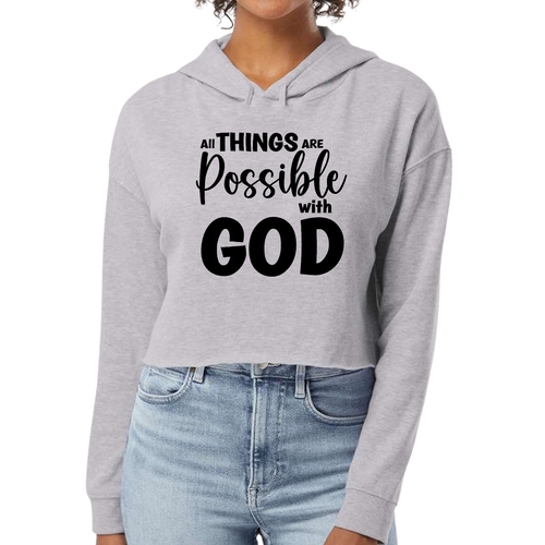 Introducing the Women's Cropped Hoodie: 'All Things are Possible with God' in a sleek black color. This stylish and comfortable hoodie is perfect for women who want to express their faith while staying fashionable. Made from a high-quality cotton and polyester blend, this hoodie is designed to provide both comfort and durability, ensuring it will last through many wears and washes.