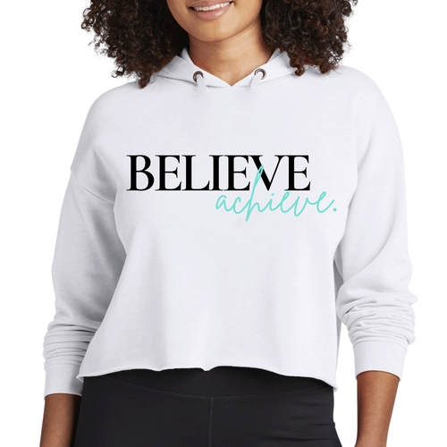 Introducing the Womens Cropped Hoodie 'Believe and Achieve', a perfect blend of style, comfort, and motivation. This hoodie is designed for women who want to express their inspirational mindset while enjoying the cozy feel of high-quality materials. Made from a durable cotton/polyester blend, this cropped hoodie is pre-shrunk to ensure a perfect fit wash after wash.