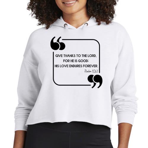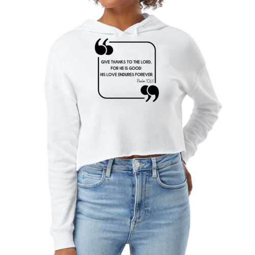 Embrace comfort and style with our Women's Cropped Hoodie featuring the 'Give Thanks to the Lord' black illustration. It's more than just a hoodie; it's a statement piece that reflects your values and personal style.
