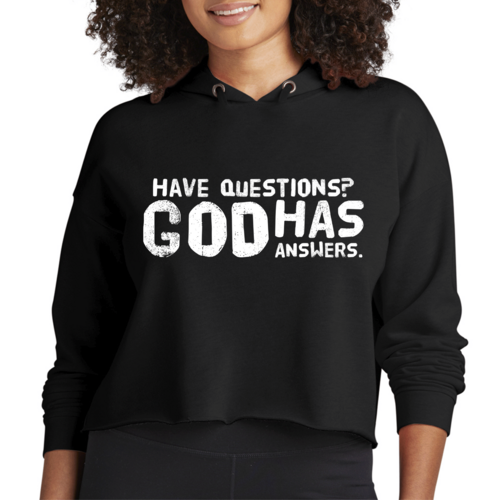 Introducing our Women's Cropped Hoodie with the inspiring print 'Questions God has Answers'. This hoodie is not just a piece of clothing; it's a statement of faith and style. Made from a high-quality cotton and polyester blend, this hoodie is designed to provide comfort and durability, making it an essential addition to your wardrobe.