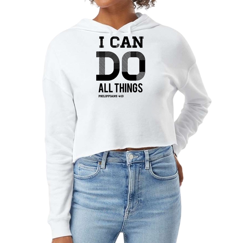 Introducing our Women's Cropped Hoodie featuring the inspiring scripture from Philippians 4:13, 'I Can Do All Things.' This stylish and comfortable hoodie is perfect for women who want to express their faith while staying fashionable. Made from a high-quality cotton and polyester blend, this hoodie is designed to provide both comfort and durability, making it an ideal choice for everyday wear.