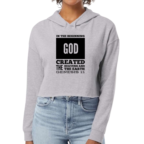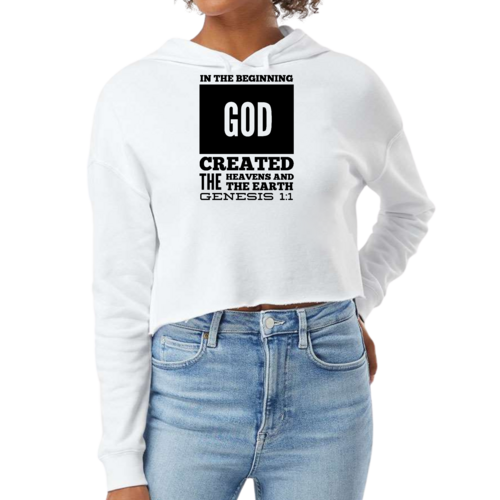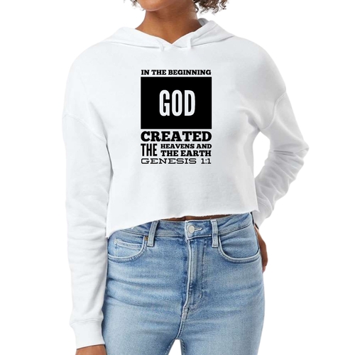 Introducing our Women's Cropped Hoodie in the Beginning Print, a stylish and comfortable addition to your wardrobe. This unique hoodie features the inspiring scripture verse, 'In The Beginning God Created The Heavens And The Earth,' printed boldly on the front. Made from a high-quality cotton and polyester blend, this hoodie is designed to provide both comfort and durability, making it perfect for everyday wear.