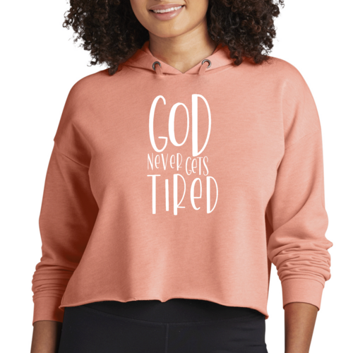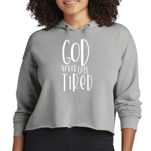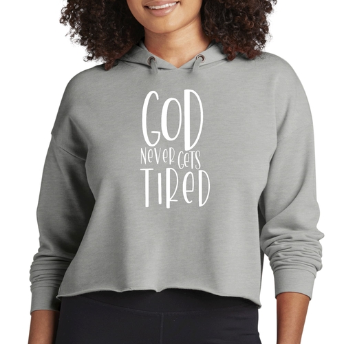 The Womens Cropped Hoodie features a unique graphic that reads 'God Never Gets Tired', making it a perfect choice for those who want to express their beliefs and creativity through fashion. This eye-catching design resonates with artistic souls who appreciate clothing that tells a story. The drawstring neckline and hood provide additional style options, allowing you to adjust the fit to your liking.