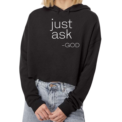 In summary, the Women's Cropped Hoodie with the 'Just Ask-God' statement is a must-have for anyone looking to blend comfort, style, and inspiration. With its high-quality materials, trendy design, and versatile nature, this hoodie is perfect for everyday wear or as a thoughtful gift for loved ones.