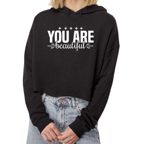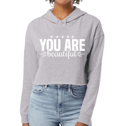 Introducing our Women's Cropped Hoodie, a stylish and comfortable addition to your wardrobe that not only looks great but also inspires positivity with its beautiful affirmation: 'You are Beautiful.' This hoodie is designed for women who appreciate both fashion and comfort, making it a perfect choice for casual outings, lounging at home, or hitting the gym.