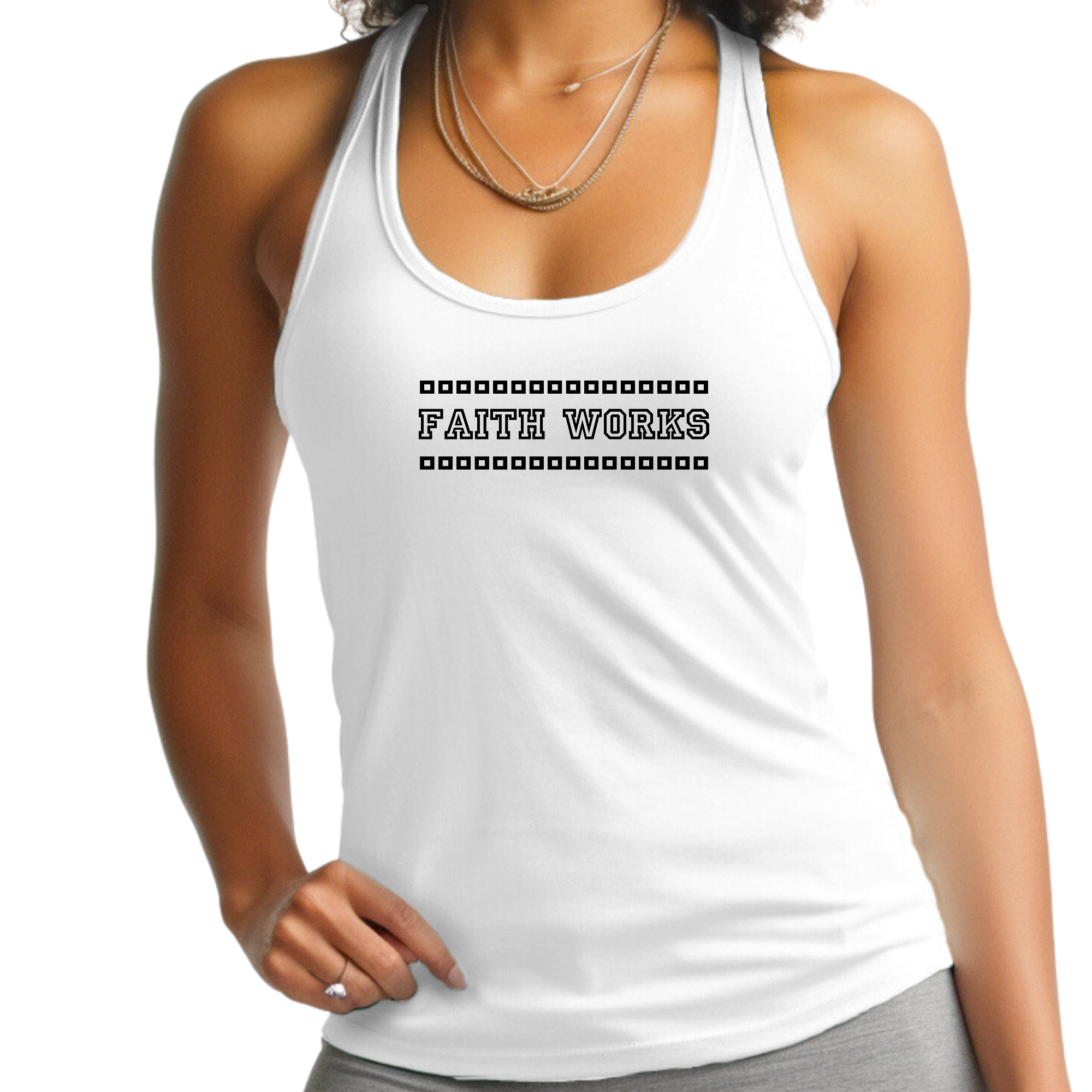 This tank top is not just for workouts; it can also be styled for casual outings or lounging at home. Pair it with your favorite leggings or shorts for a complete look that is both functional and fashionable. The 'Faith Works' graphic adds a motivational touch, making it a perfect choice for those who want to express their beliefs while staying active.