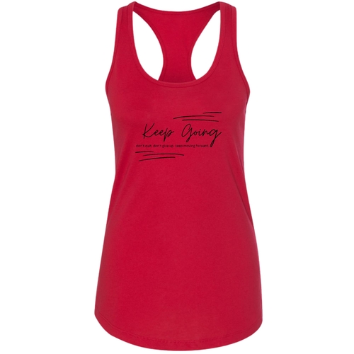 Women's black fitness tank top with 'Keep Going Don't Give Up' graphic, made from soft preshrunk cotton, ideal for workouts.