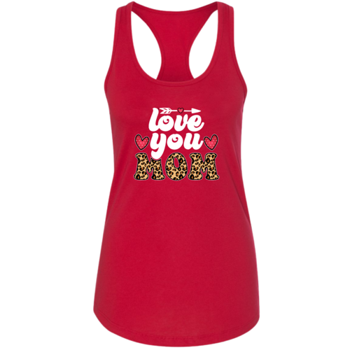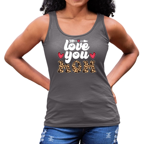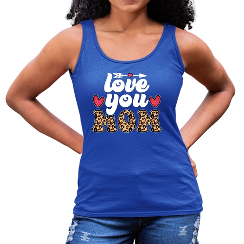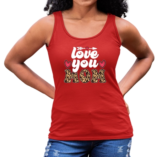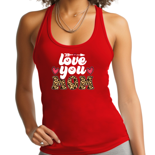 Introducing our Women's Fitness Tank Top Graphic T-shirt, designed to celebrate the special bond between mothers and their children. This unique tank top features a heartfelt 'Love You Mom' message adorned with a trendy leopard print, making it a perfect choice for Mother's Day or any day you want to show appreciation for your mom. Crafted from soft, preshrunk cotton, this tank top ensures comfort and durability, allowing you to wear it during workouts or casual outings.