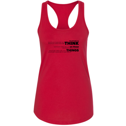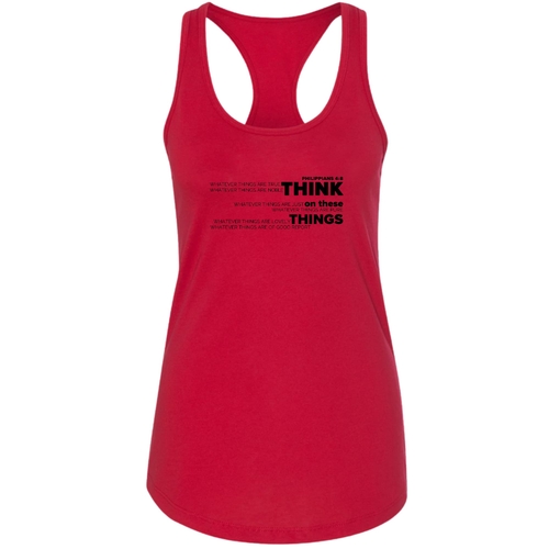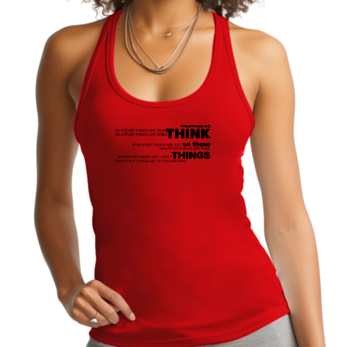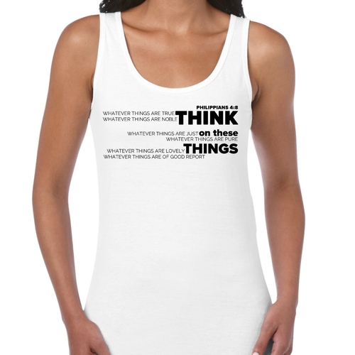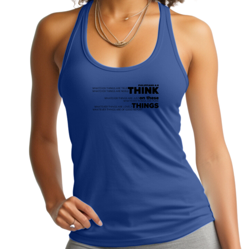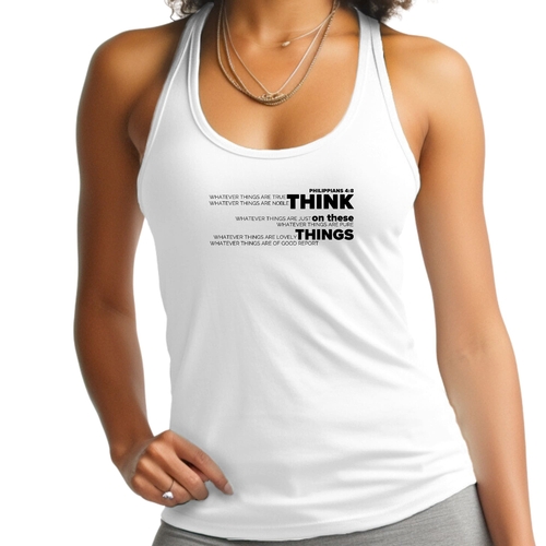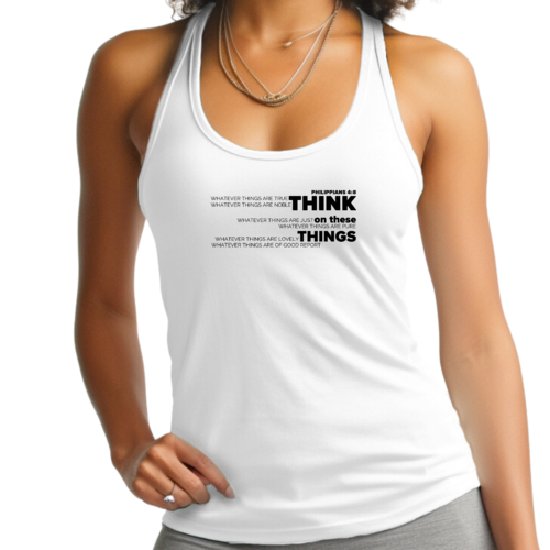 This tank top is not just for workouts; it can be styled in various ways for different occasions. Pair it with your favorite leggings for a workout session, or wear it with shorts for a casual day out. The 'Think on these Things' graphic adds a motivational touch, making it a great conversation starter and a perfect gift for friends and family who appreciate fitness and faith.