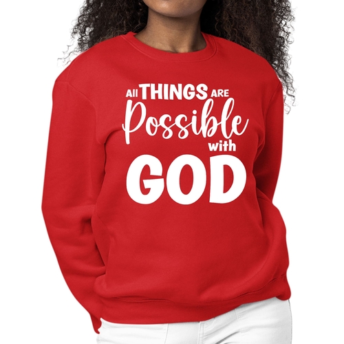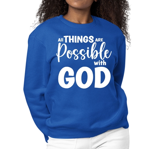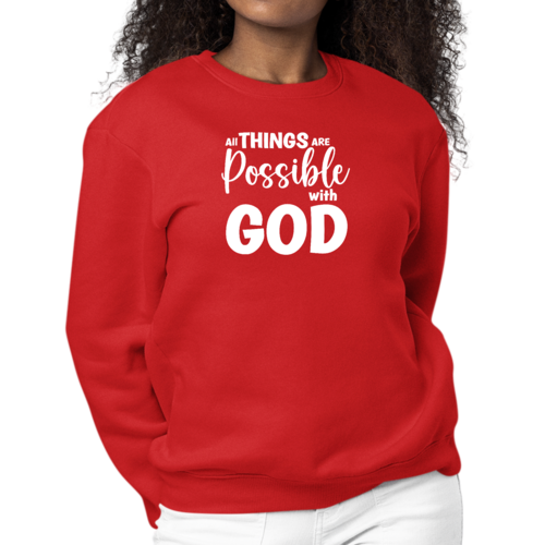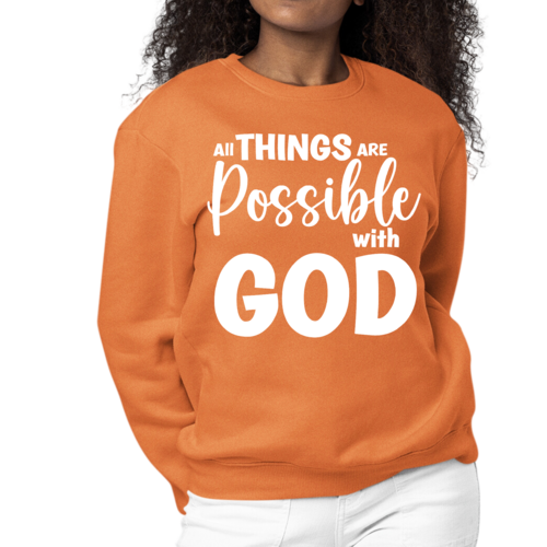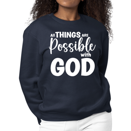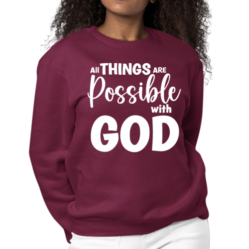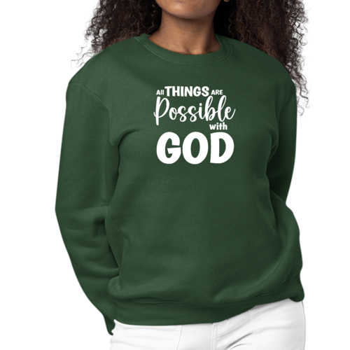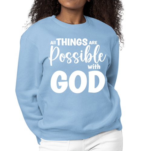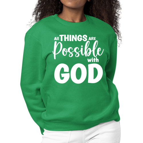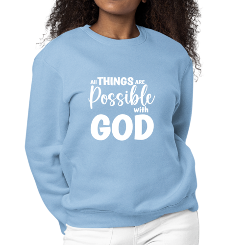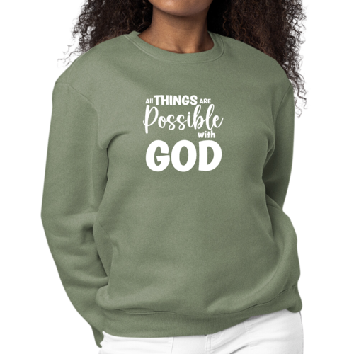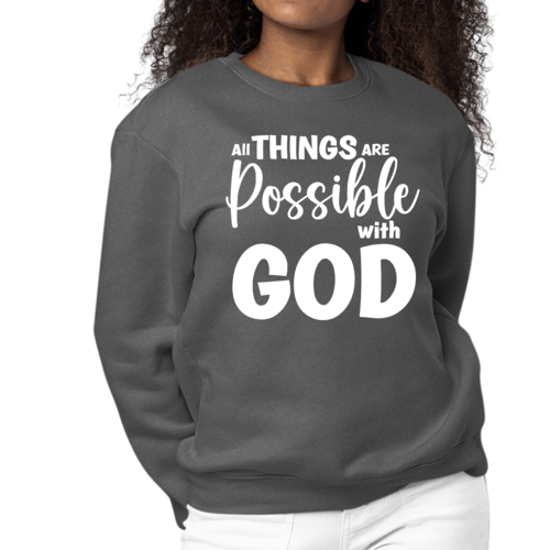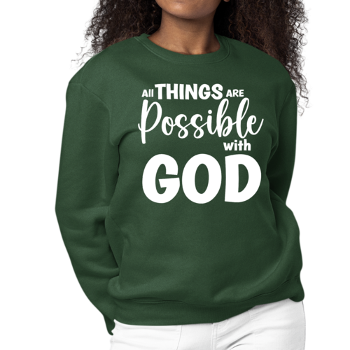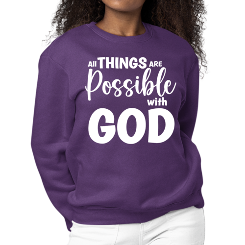 Featuring a bold graphic that reads 'All Things Are Possible With God,' this sweatshirt serves as a daily reminder of faith and positivity. The unisex fit makes it suitable for a wide range of body types, and the double-stitched reinforced seams add to its durability, ensuring that it will last for years to come.