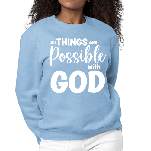 Introducing our Women's Graphic Sweatshirt featuring the uplifting message, 'All Things Are Possible With God.' This stylish and comfortable crewneck sweatshirt is perfect for those who want to express their faith while enjoying a cozy fit. Made from a durable 50/50 cotton and polyester blend, this sweatshirt is designed to withstand daily wear while providing exceptional comfort.