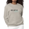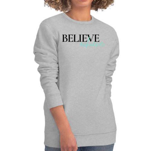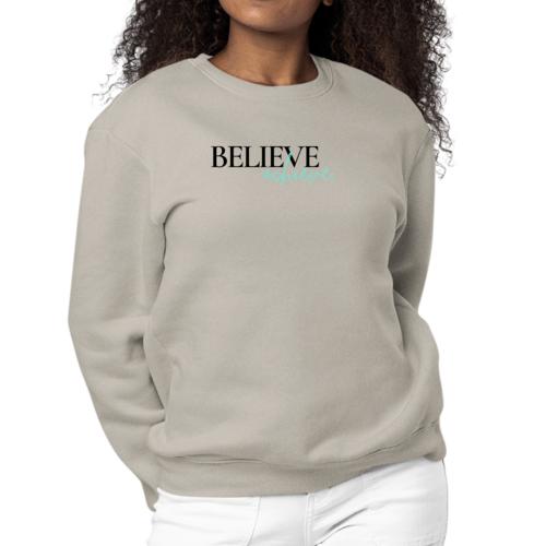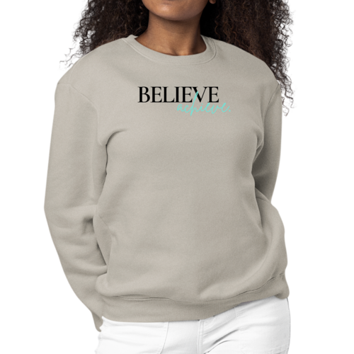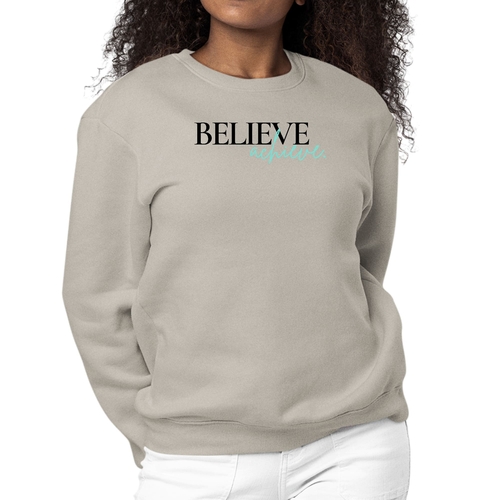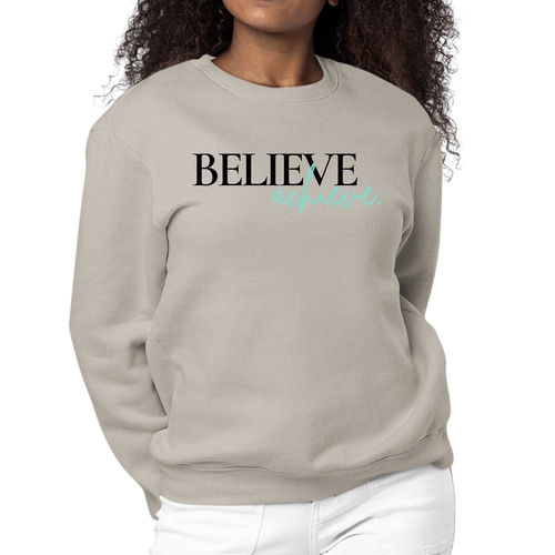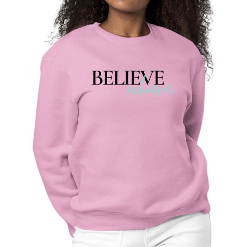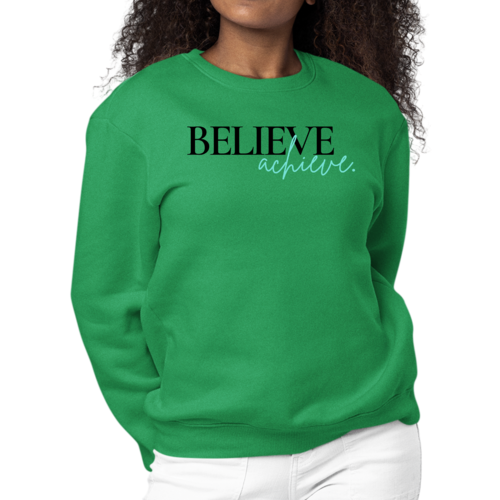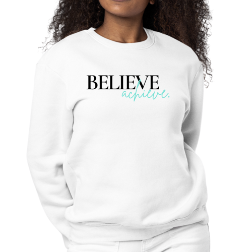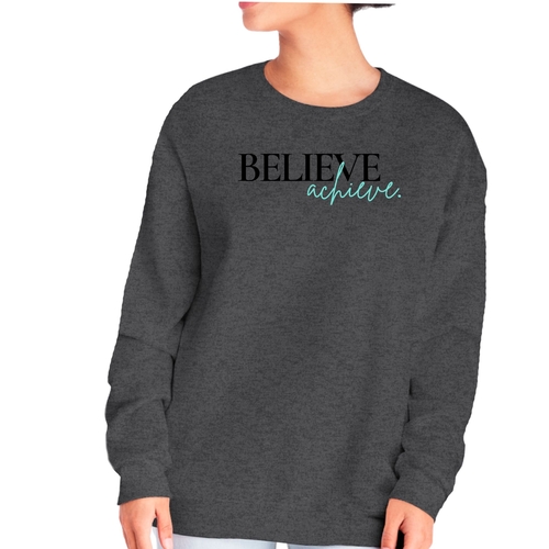 Introducing the Women's Graphic Sweatshirt featuring the motivational phrase 'Believe and Achieve'. This stylish and comfortable sweatshirt is perfect for women who want to express their aspirations while enjoying a cozy fit. Made from a durable 50/50 cotton and polyester blend, this sweatshirt is designed to withstand daily wear while providing the comfort you need.
