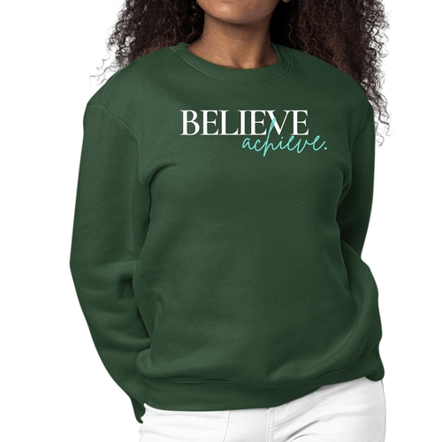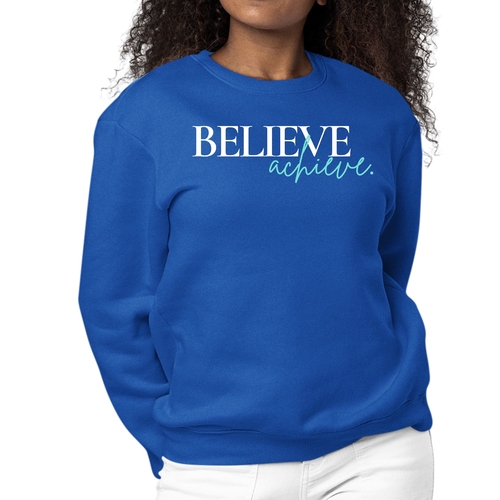 Introducing the Women's Graphic Sweatshirt, 'Believe and Achieve', a perfect blend of comfort and motivation. This stylish crewneck sweatshirt is designed for women who appreciate both fashion and inspiration. Made from a durable 50/50 cotton and polyester blend, it ensures long-lasting wear while providing the comfort you need for all-day activities.